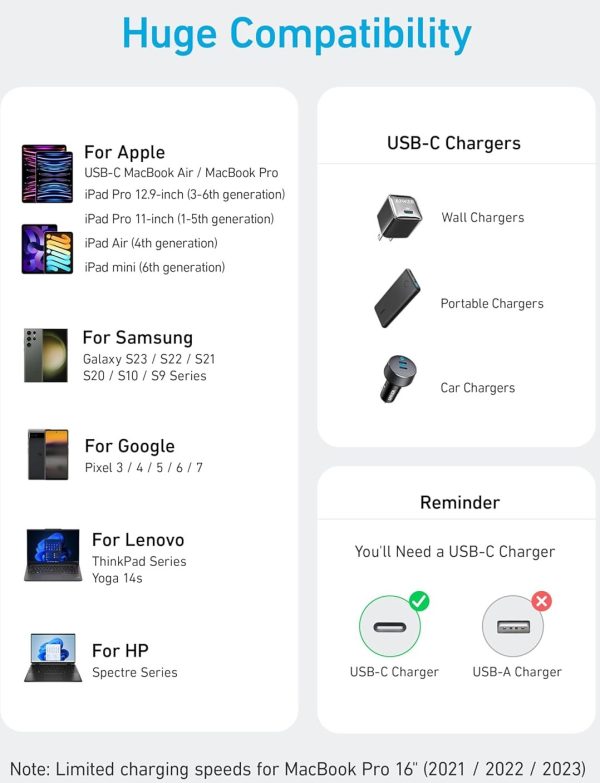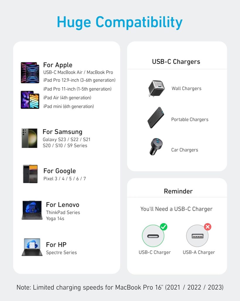 iPad Pro (1ª a 5ª generación), Samsung Galaxy S23 / S22 / S21 / S20 / S10 / S9 Series, Google Pixel 3 / 4 / 5 / 6 / 7, Lenovo ThinkPad Series / Yoga 14s, HP Spectre Series, MacBook Pro de 16 pulgadas (2021 / 2022 / 2020 / 2020 / 20 23 US