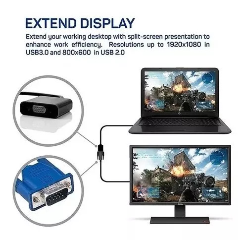 - Permite duplicar contenidos en una pantalla VGA desde su dispositivo equipado con puerto USB 3.0